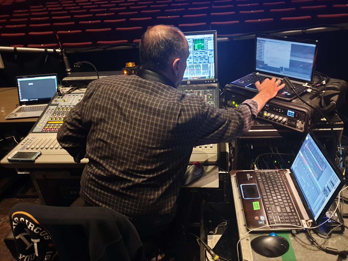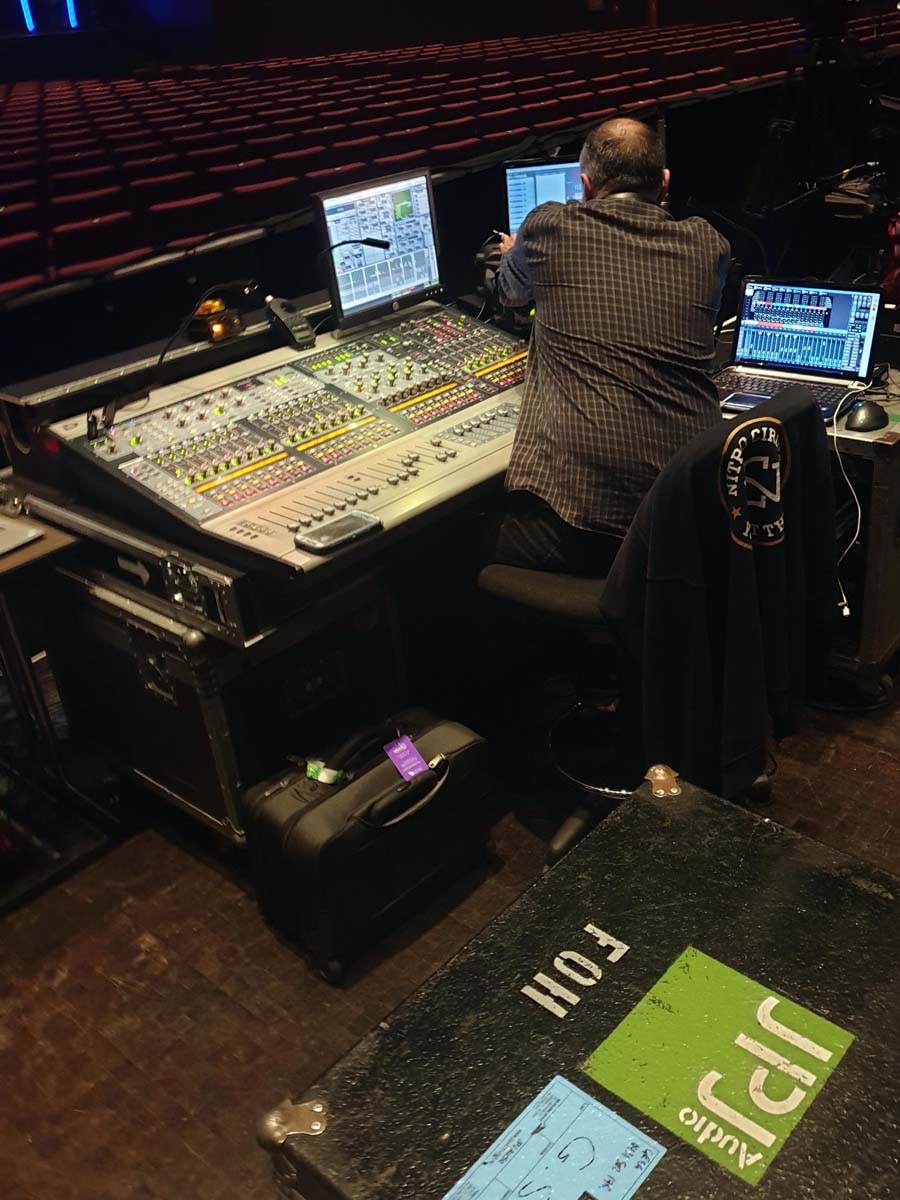 The show is so complex that two sound operators are required at FOH. One operator is kept busy mixing the mics and vocal effects on a DiGiCo SD10T, whilst the other person triggers the sound effects and music on QLab and Ableton Live , through a Yamaha CL5.