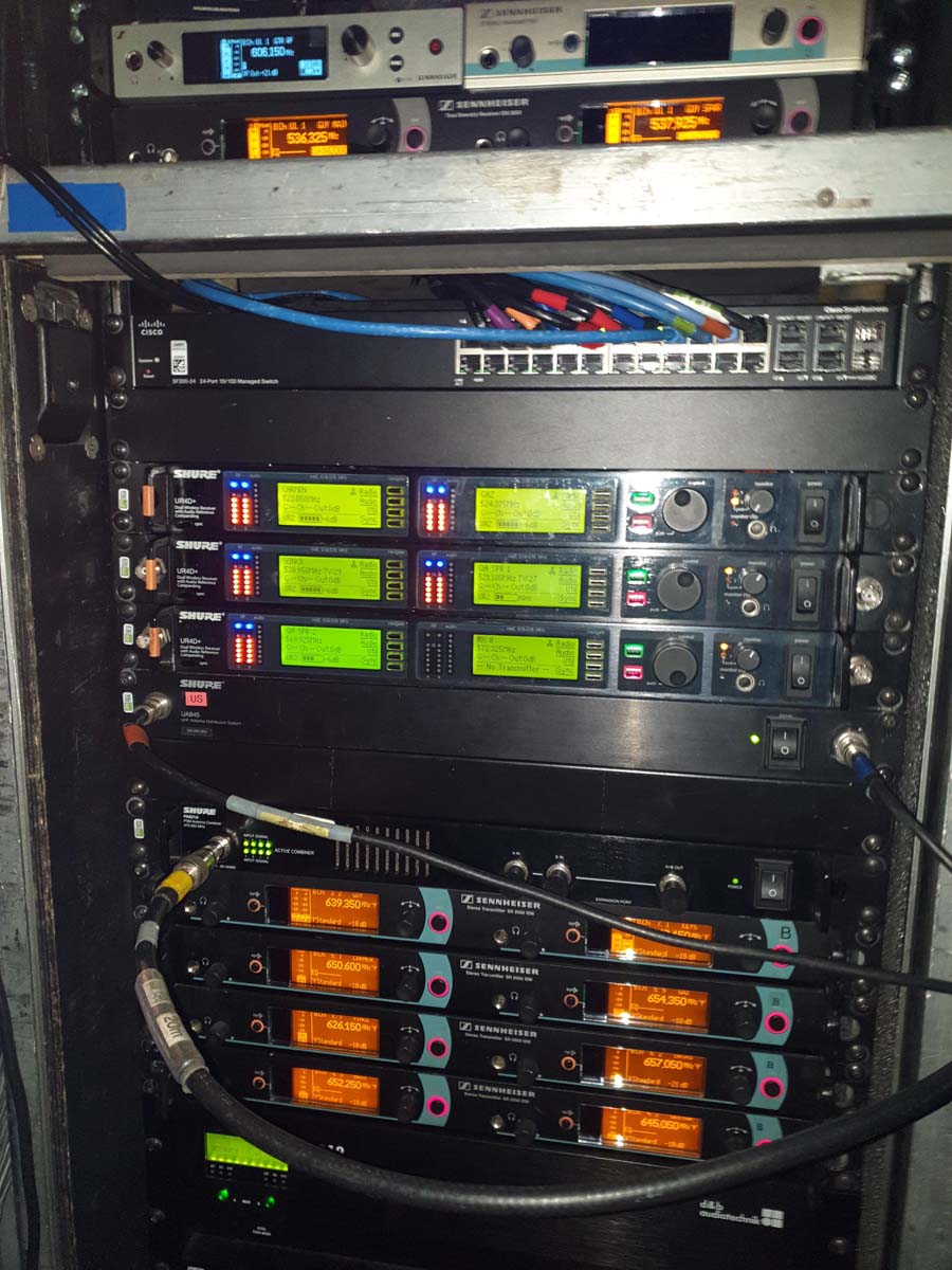 A Nowsonic 2.4Ghz /5Ghz Stage Router is used on stage which George says delivers excellent coverage.