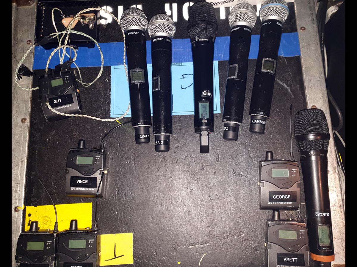Guy, who has an endorsement with Sennheiser, used an EM 2050 two channel wireless receiver, two SKM 2000 handheld wireless transmitters, along with two KK 205 Neumann Condenser Microphone capsules.