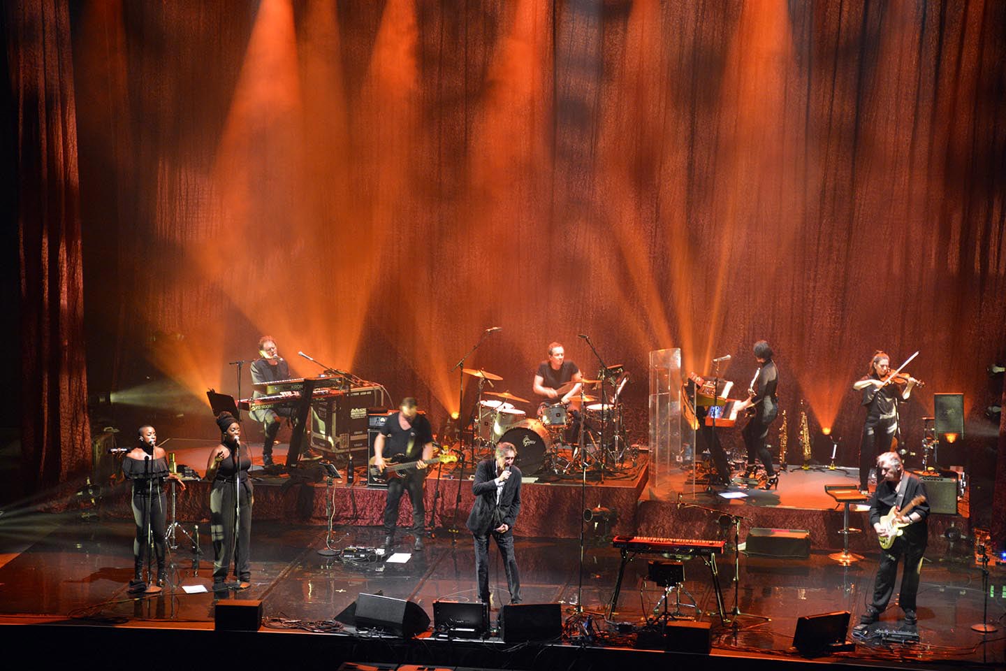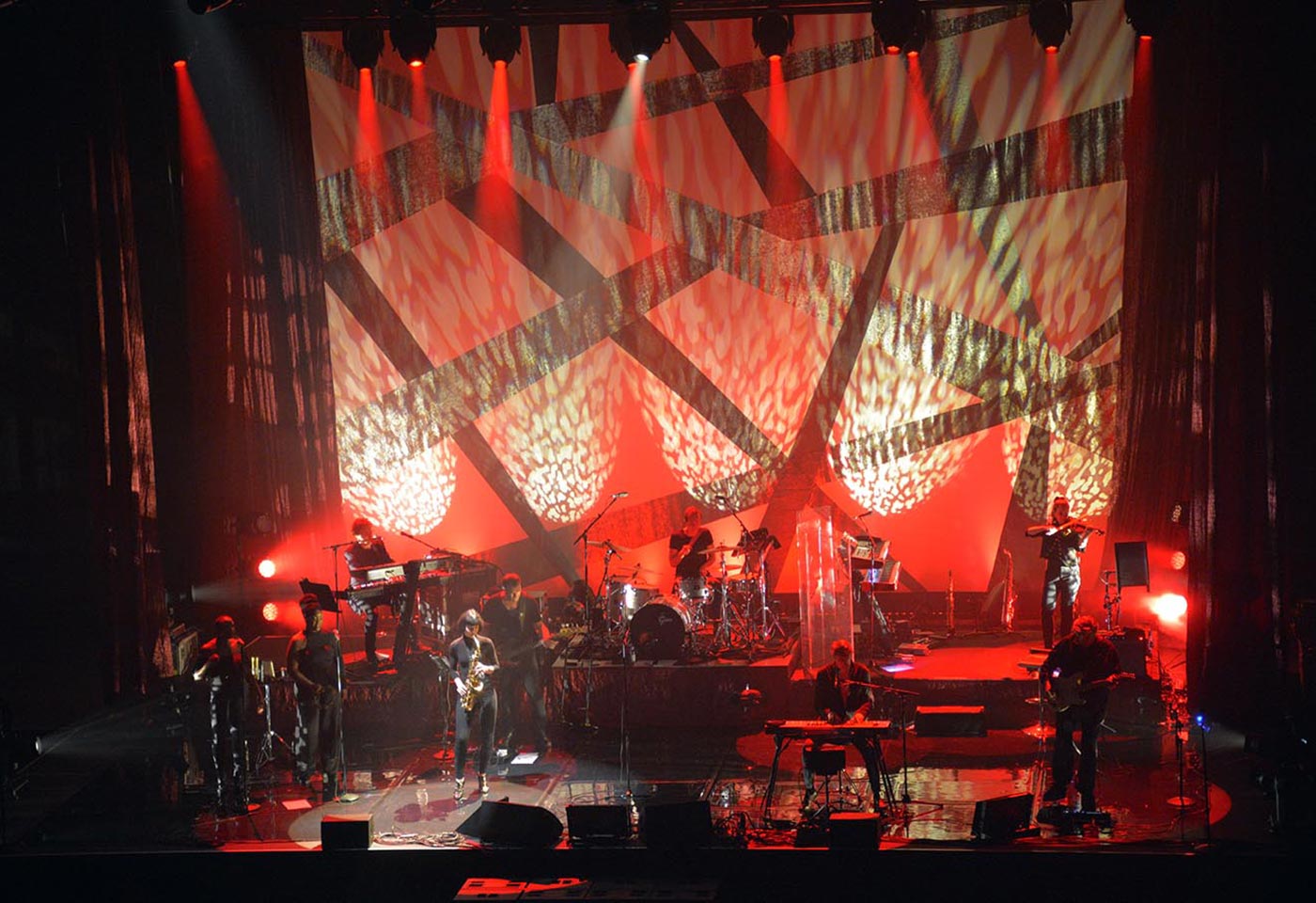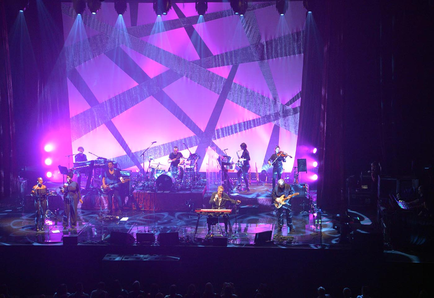 The tours utilized an L-Acoustics K1/K2 PA system with SB28s subs and a front face of ARCs and 108s, all controlled by Lake and LA network. At the ICC in Sydney the set up was 12 K1s and four K2s on the main hangs with side hangs of 12 K2s, four subs flown, four ARCs per side as outfills, two ARCs per side as infill and 218s as front fills.