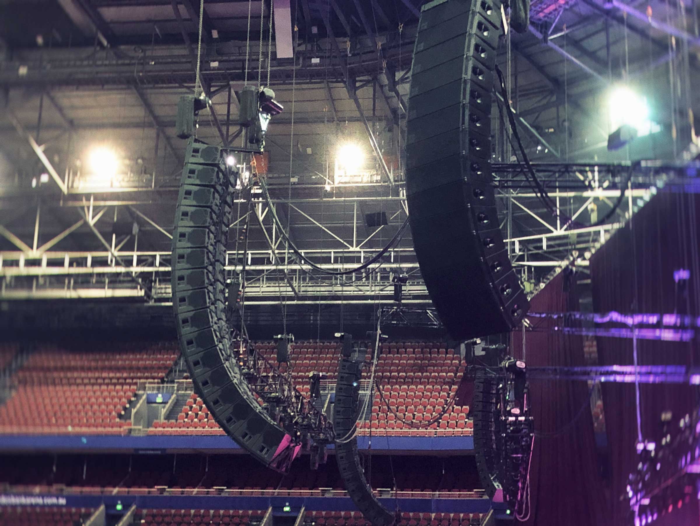 The curvature of the system is designed and configured to get right up into the stands and areas that physically are very difficult to reach. Behind the mix position which is 36m away from the stage, are four delay positions placed in an arc shape to ensure sound reaches the back of the stadium.