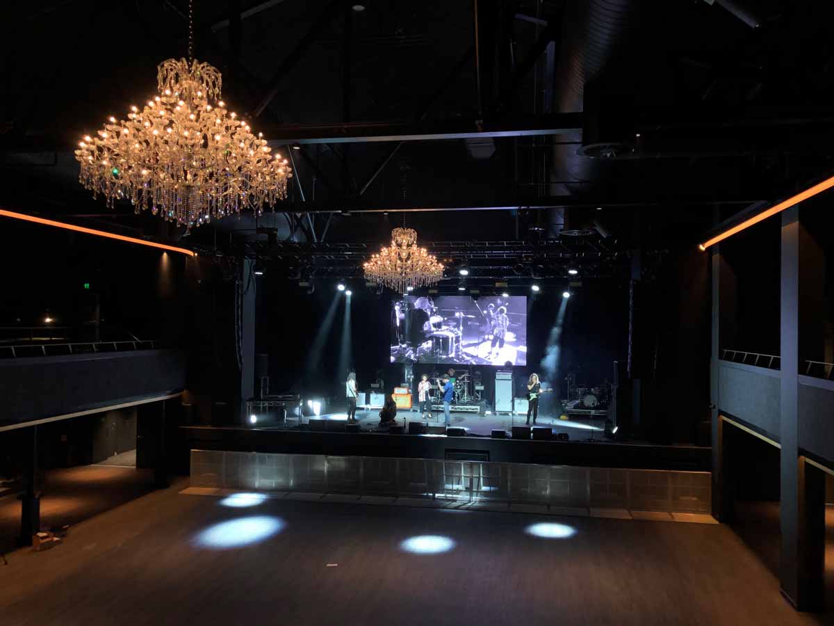 The main system is 16 x K2 (eight per side flown) with 12 x SB28 subs in pods of two running across the front of the stage. Downstairs there are two zones per side of two ARCS Focus, totaling eight, and four X8 live monitor enclosures for front lip-fills. Upstairs, to supplement the main hangs, there are three ARCs per side to service the outer corners and throw up the sides until the K2 takes over. At the rear of the room under the balcony are some more X8s filling in.