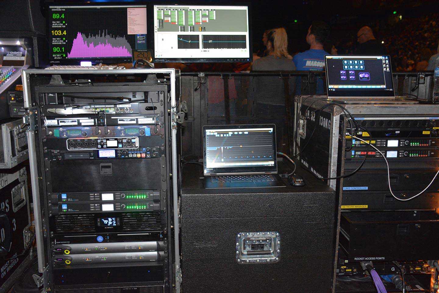 Systems engineer Mathew McQuaid used Soundvision, L-Acoustics’ proprietary acoustic prediction software, and Rational Acoustics Smaart 8 to align the system each night.
