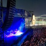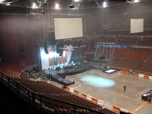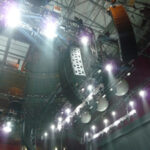 With four massive video screens forming a cube above the round stage, a neat and tidy PA system was required so as not to interfere with the visuals. Eight hangs of nine L-Acoustics dV-Dosc were deployed all in a left/right configuration at each corner.