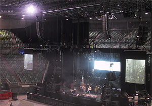 For the first time, Bruce used all Nexo on one tour, as the monitor system was also Nexo branded. Rod Matheson generated 4 in ear, and eight equalized sends of stage monitors from a Midas XL 250 console. 14 Nexo PS15 wedges were used, along with 2 Alpha E full range boxes on each side of stage as sidefills.