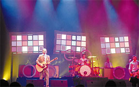 Hugh operates the Whole Hog III, a wingboard, and three Catalysts – with 3 Mac G4 and 2 laptops. His FOH setup is complex, and hubbed together via an Ethernet switch. It is impressive to watch him work all this, alone, while calling two followspots. For the first half of the show, the three Silverchair members are joined by two guest keyboard players who are set on stage left, above and behind the backline. Coloured panels are over each backline speaker. Six ‘zip rings’ which are a circle of ten MR 16 lamps, are hung around the backline, giving Hugh another element to go with six Zip strips – sitting vertically around the stage, and gelled in rainbow hues.