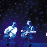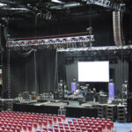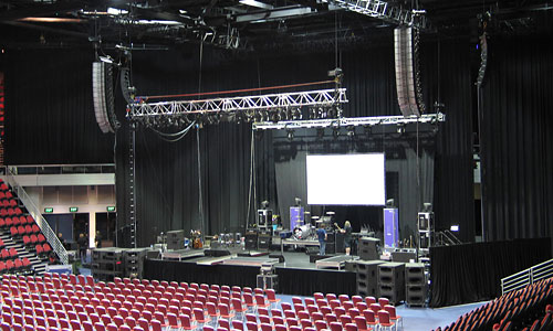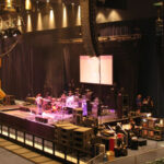 The second half is achieved after the crew reset the stage behind a curtain. The rear red drape is gone, revealing three pods of 24 Par 64’s, using 240v lamps so they can be chased in many combinations. Each is gelled.