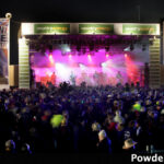 The second half is achieved after the crew reset the stage behind a curtain. The rear red drape is gone, revealing three pods of 24 Par 64’s, using 240v lamps so they can be chased in many combinations. Each is gelled.